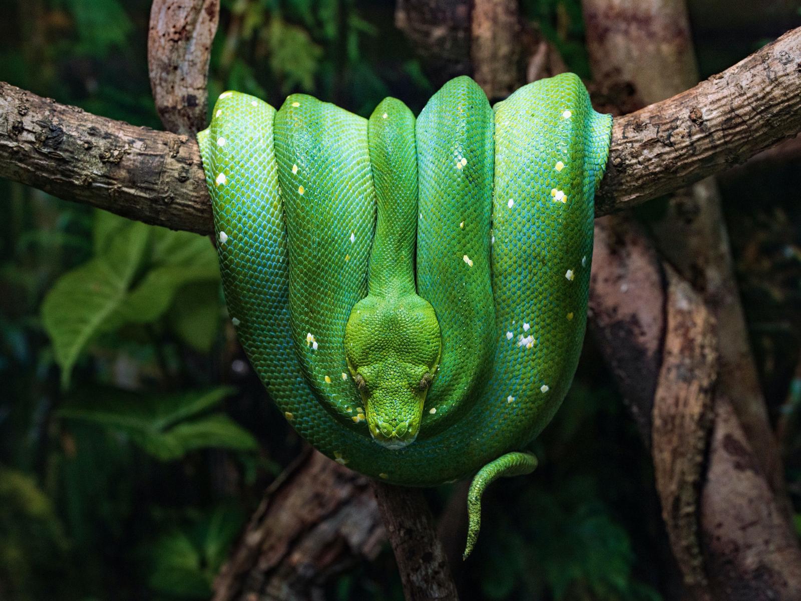 Обои Зеленая змея висит на ветке дерева