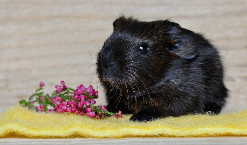 Обои Черная морская свинка с розовым цветком