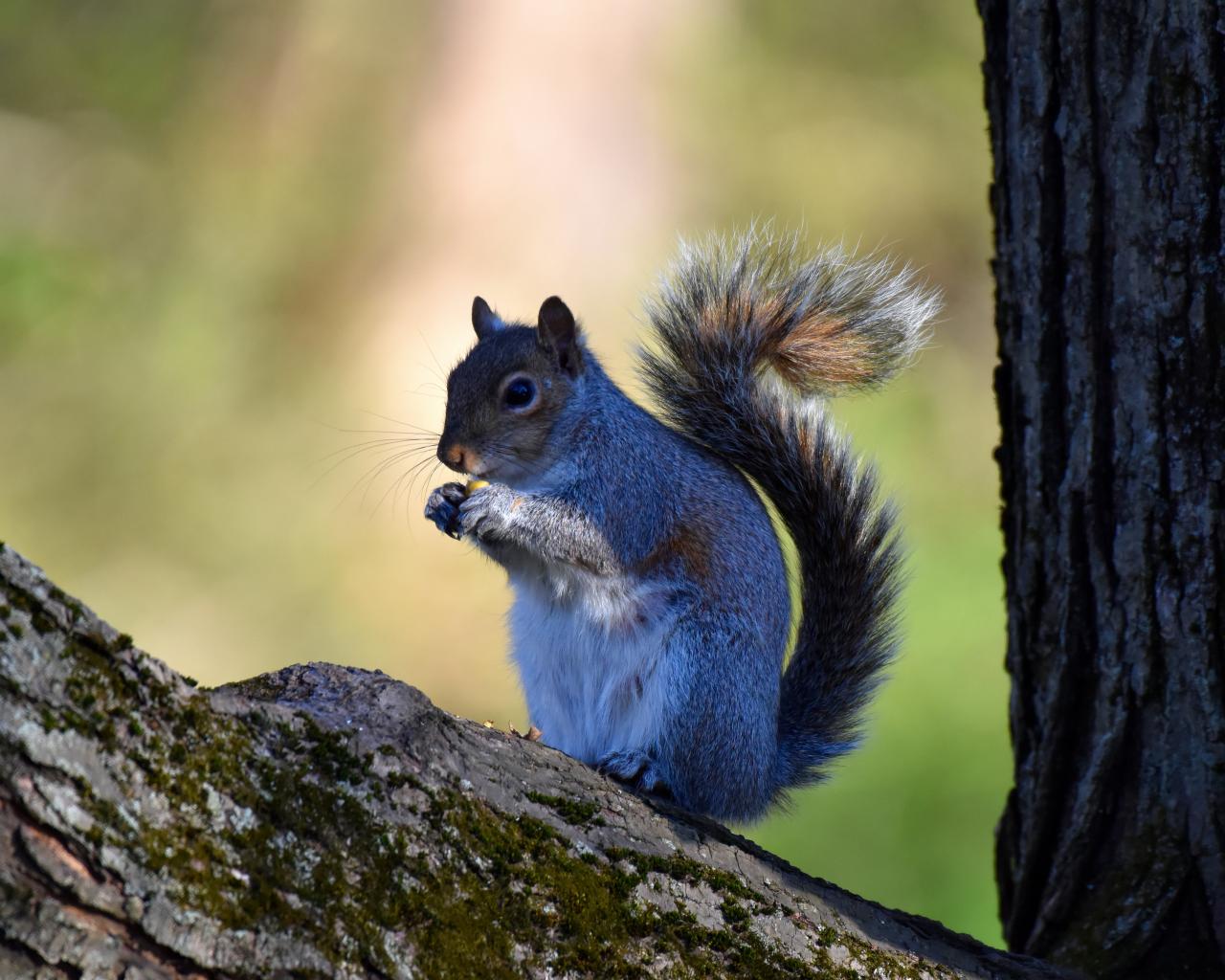 Обои Маленькая белка с орехом на дереве