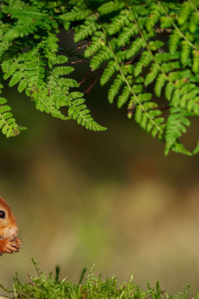 Обои Рыжая белка сидит под зеленой веткой