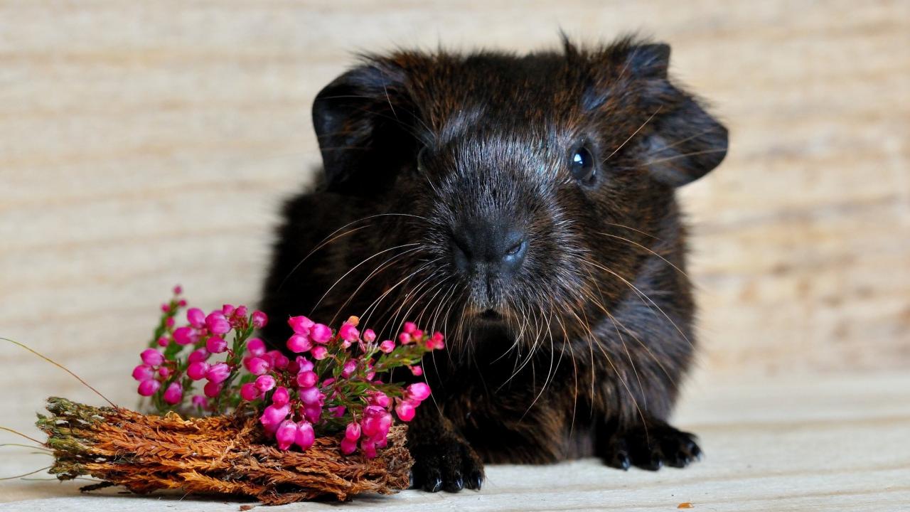 Обои Большая черная морская свинка с розовыми цветами