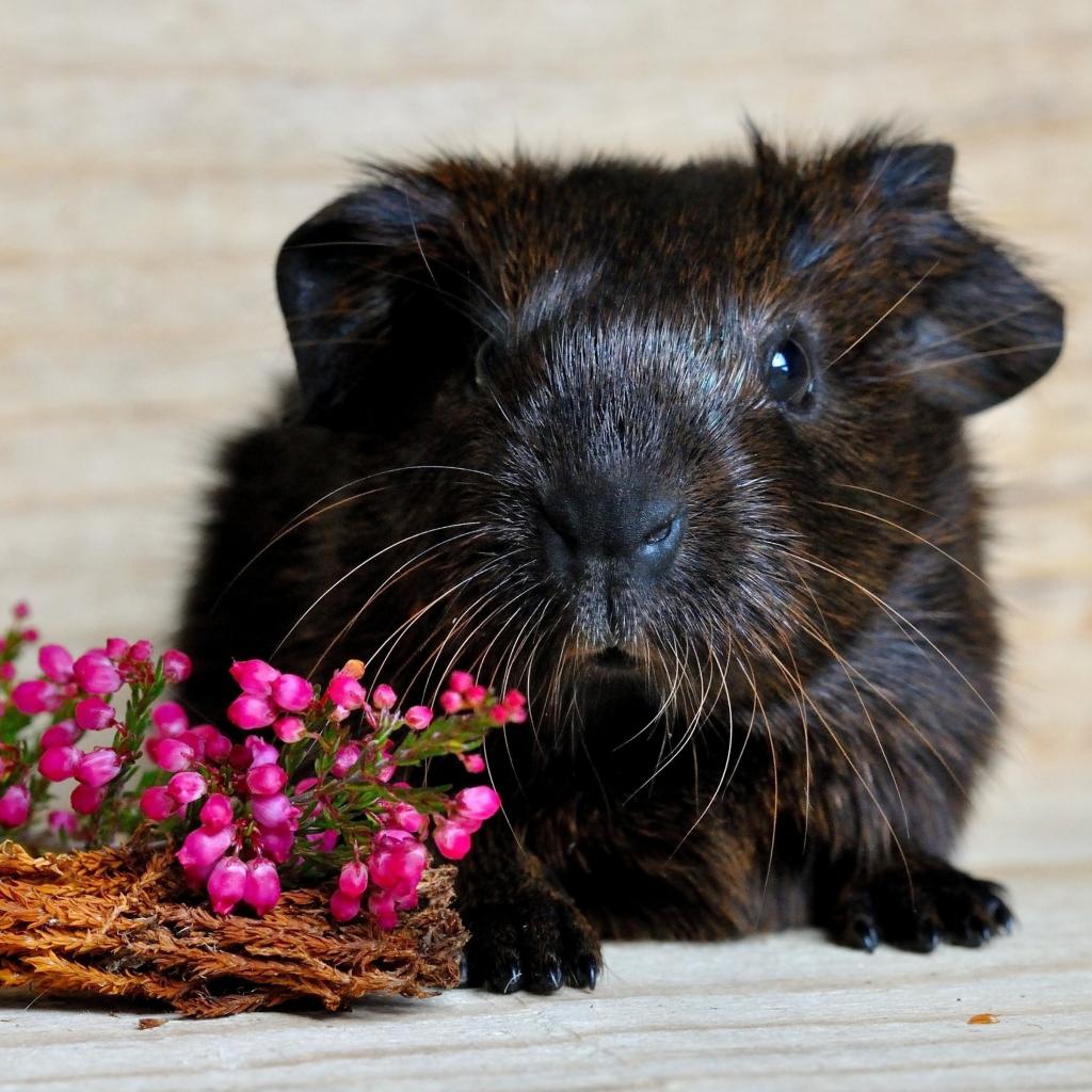 Обои Большая черная морская свинка с розовыми цветами