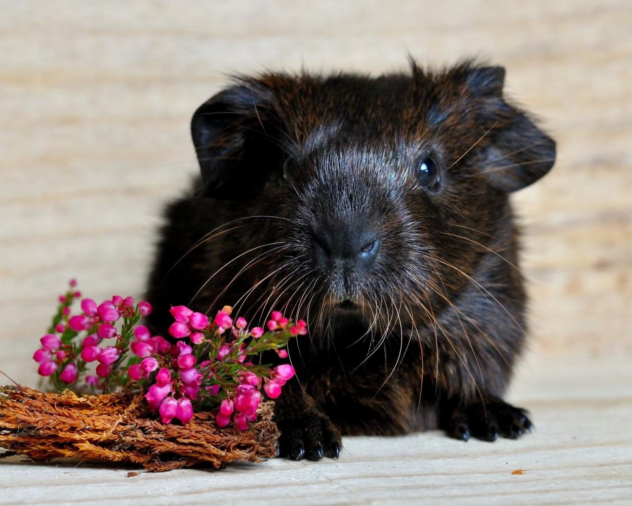 Обои Большая черная морская свинка с розовыми цветами
