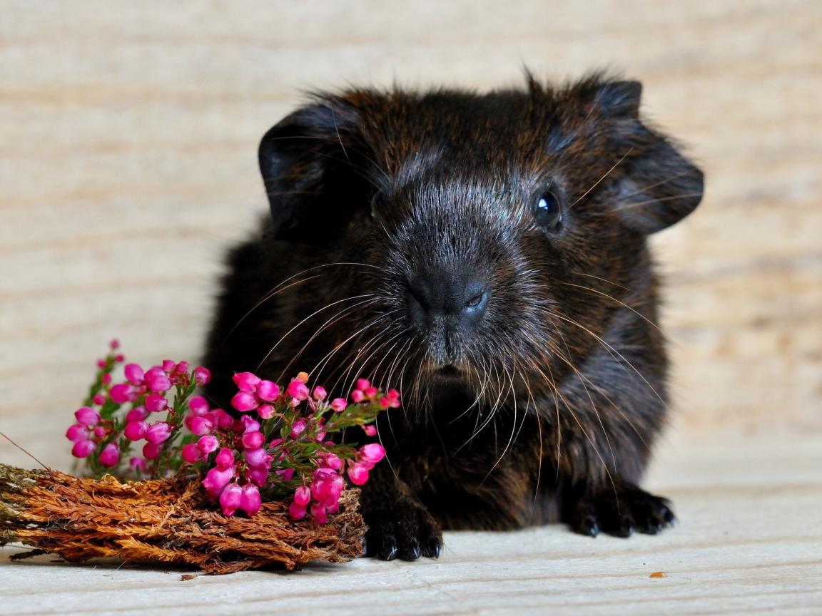 Обои Большая черная морская свинка с розовыми цветами