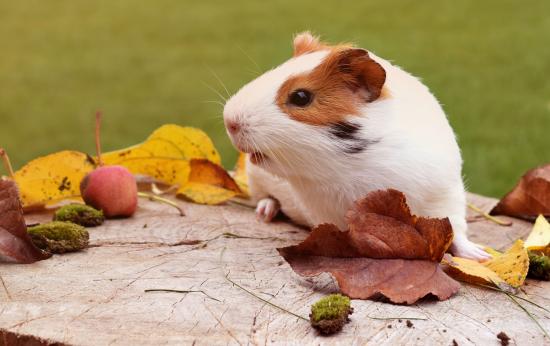 Обои Морская свинка сидит на пне с сухими листьями