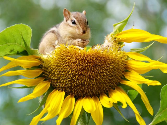 Обои Бурундук грызет желтый подсолнух