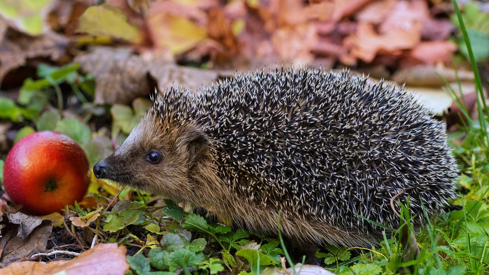 Обои Колючий еж с красным яблоком в зеленой траве