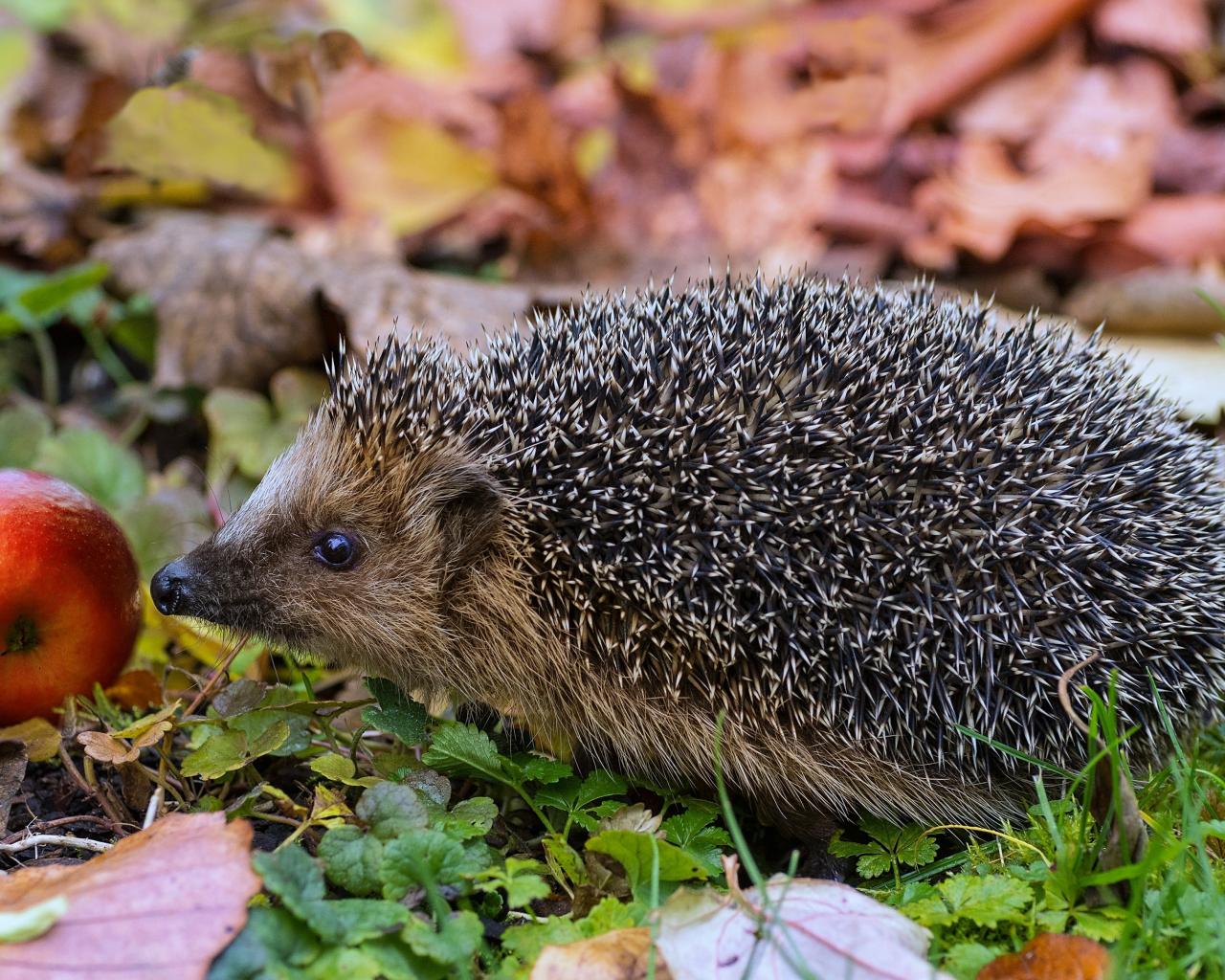 Обои Колючий еж с красным яблоком в зеленой траве