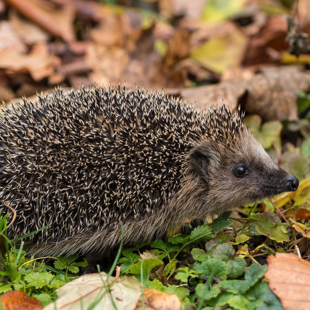 Обои Колючий еж на земле с сухими листьями осенью