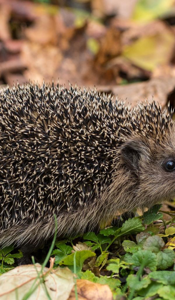 Обои Колючий еж на земле с сухими листьями осенью