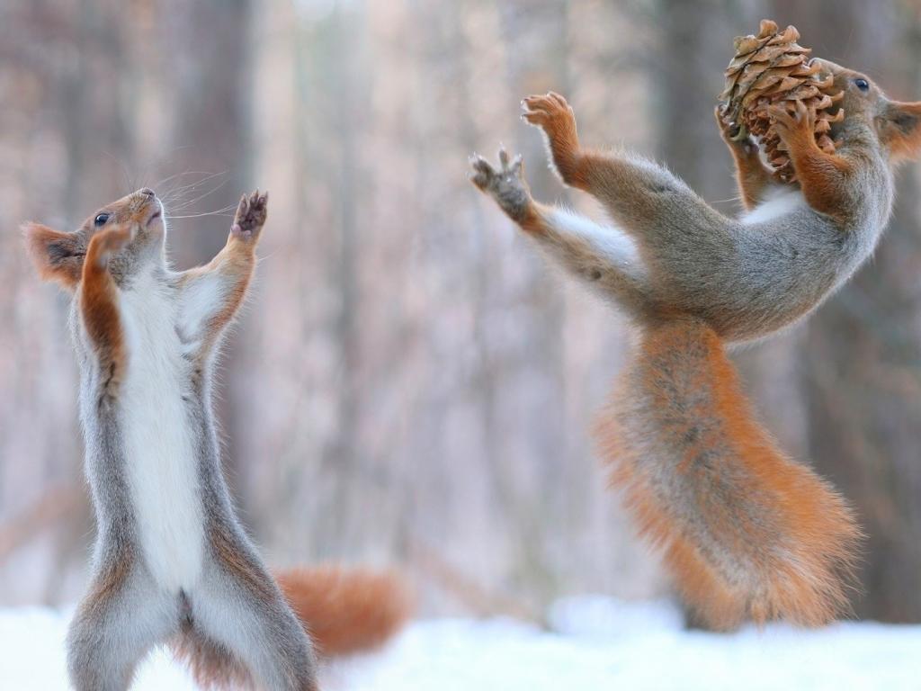 Обои Две белки играют с шишкой на снегу