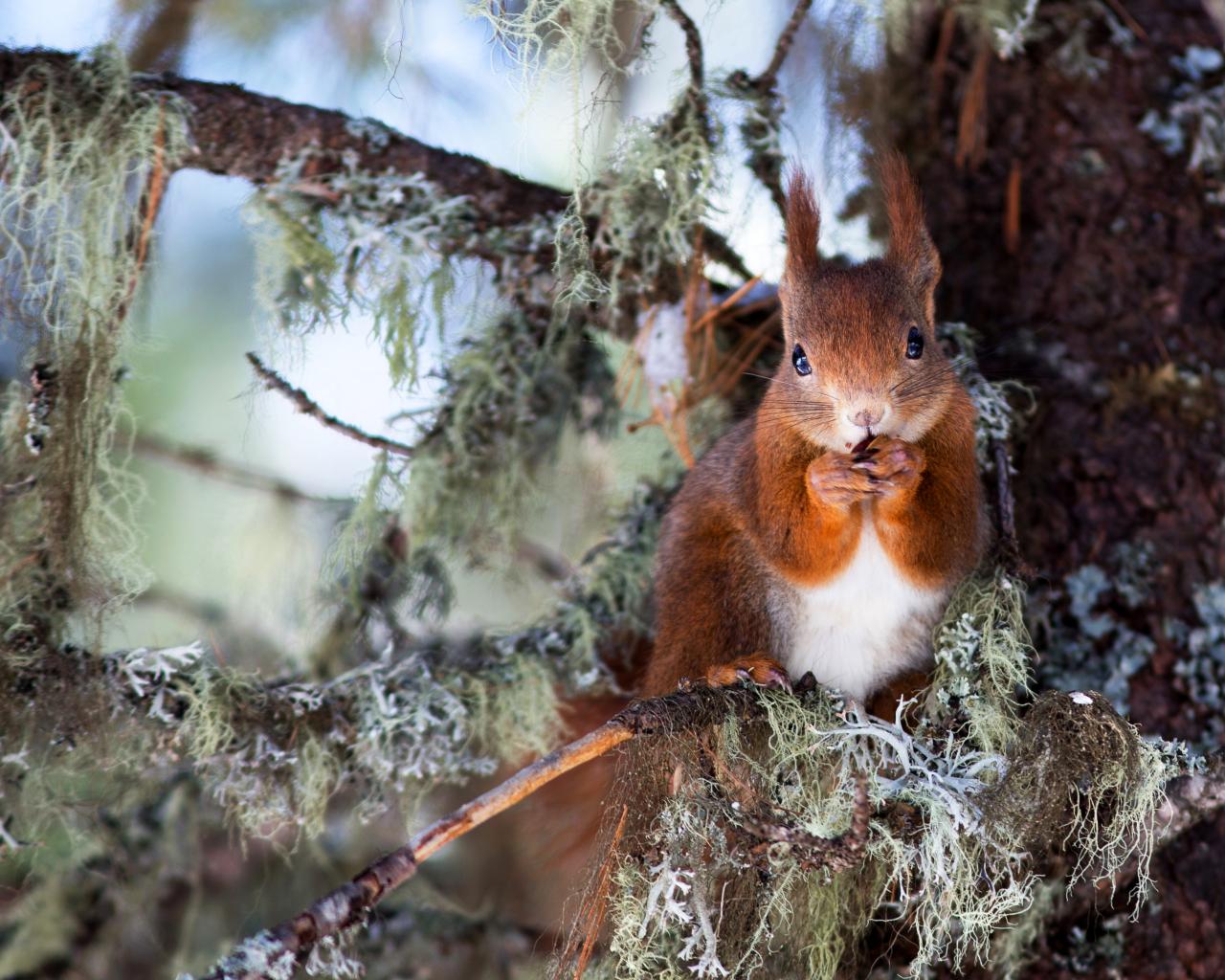 Обои Красивая рыжая белка грызет орех на дереве