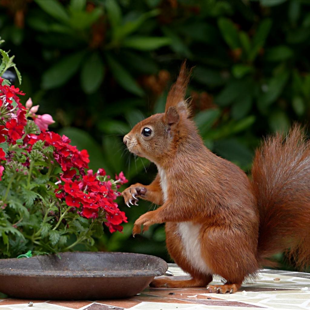 Обои Забавная рыжая белка у красных цветов
