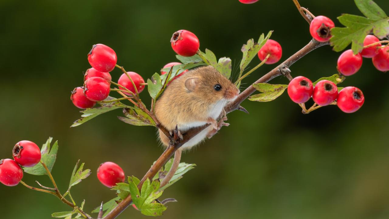 Обои Маленький мышонок сидит на ветке с красными ягодами