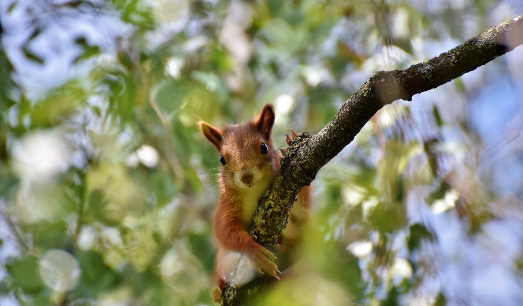 Обои Забавная рыжая белка на ветке дерева