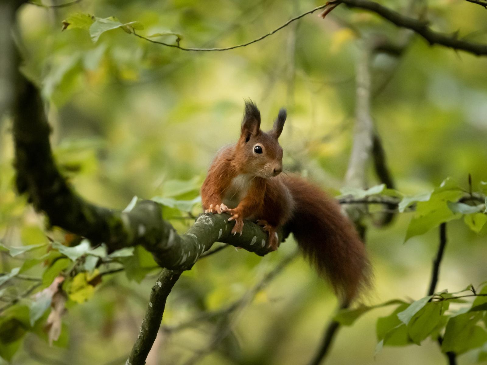 Обои Рыжая белка с пушистым хвостом сидит на ветке