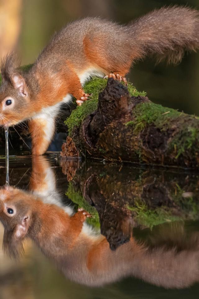 Обои Пушистая рыжая белка пьет воду