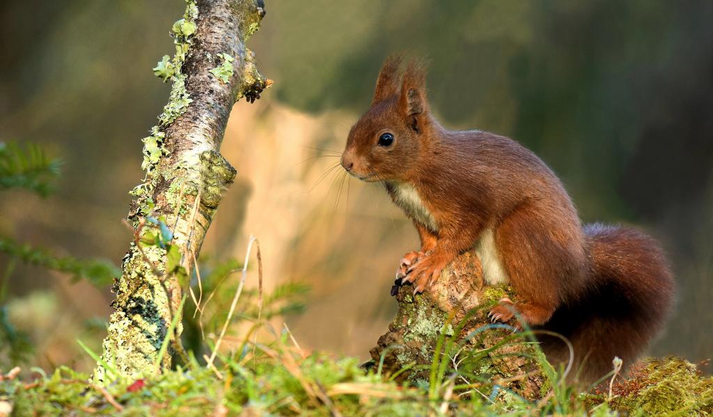 Обои Милая рыжая белка сидит на покрытой мхом коряге