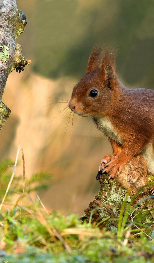Обои Милая рыжая белка сидит на покрытой мхом коряге