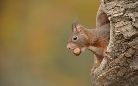 Обои Белка с лесным орехом в зубах сидит в дупле