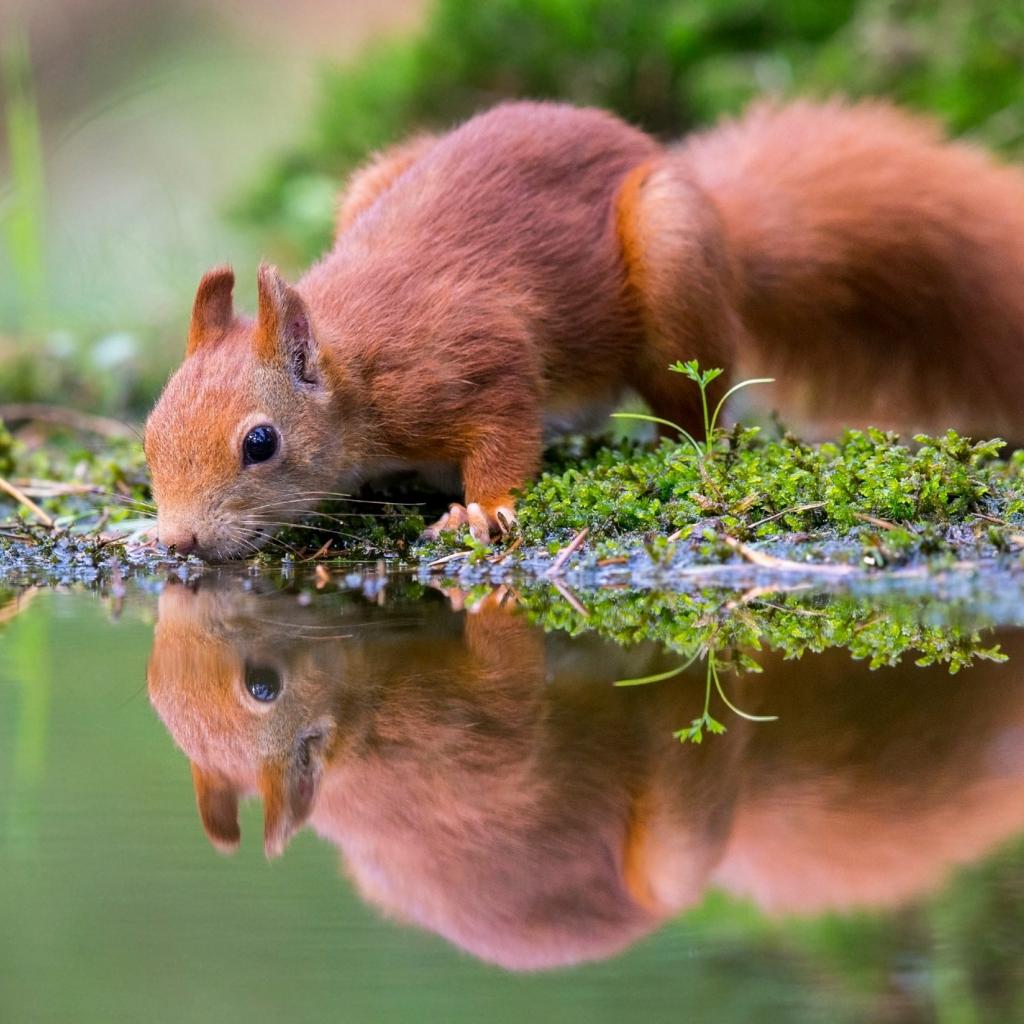 Обои Маленькая рыжая белка пьет воду в пруду