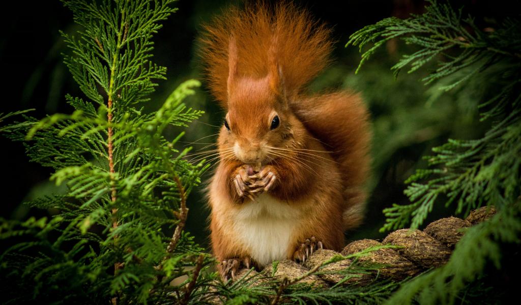 Обои Пушистая рыжая белка грызет орех на ветке