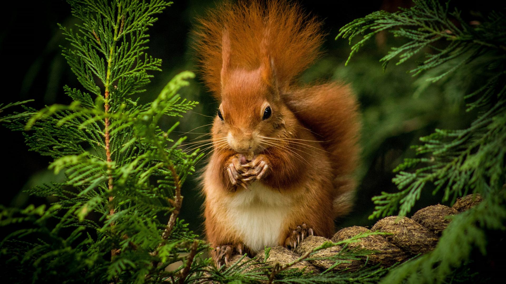 Обои Пушистая рыжая белка грызет орех на ветке