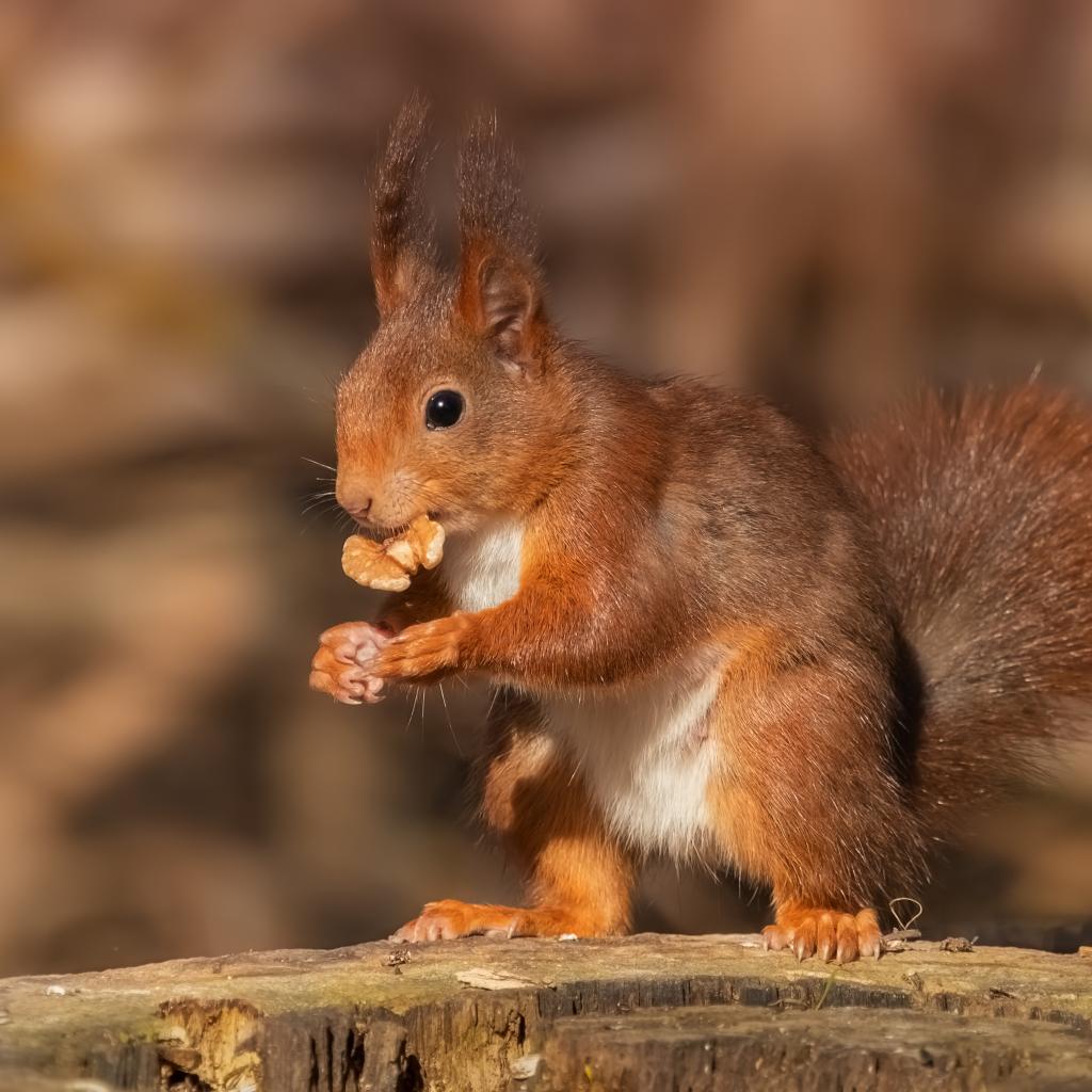 Обои Забавная рыжая белка грызет грецкий орех на пне