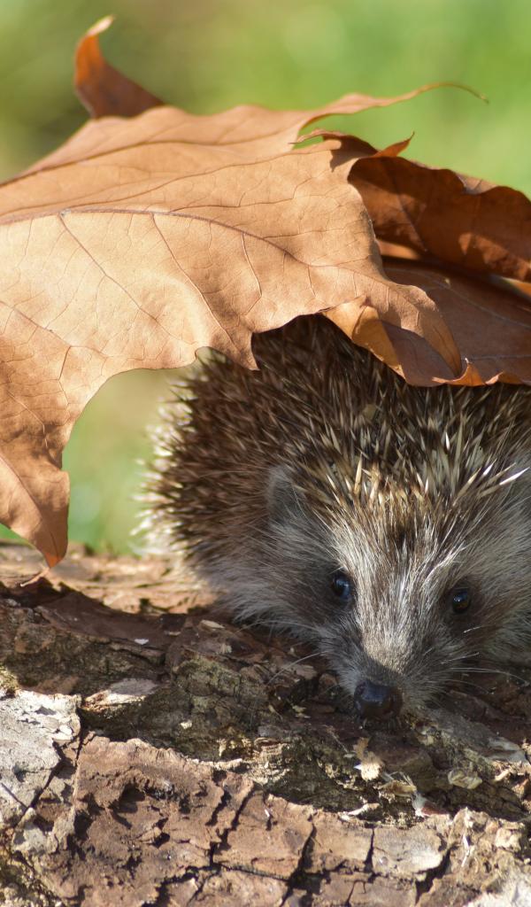 Обои Колючий еж на сухом дереве с опавшими листьями