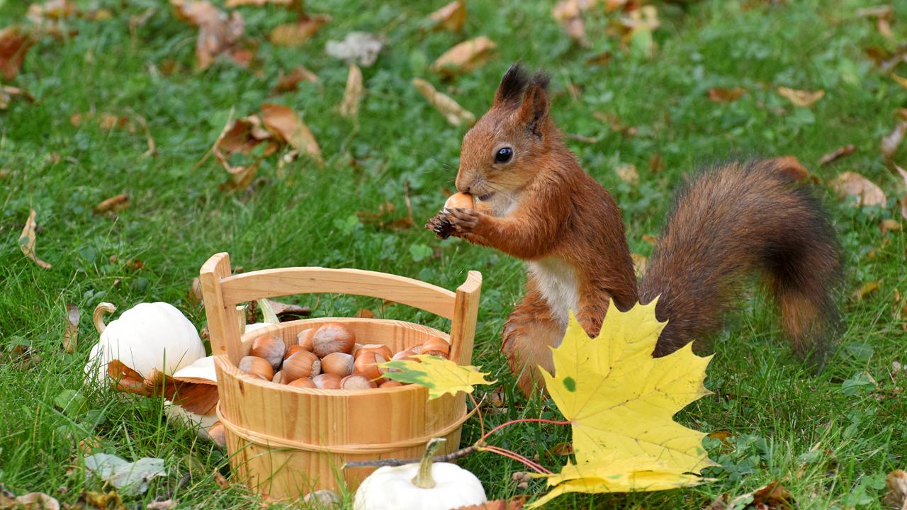 » Обои Рыжая белка грызет орехи на зеленой траве с желтыми листьями