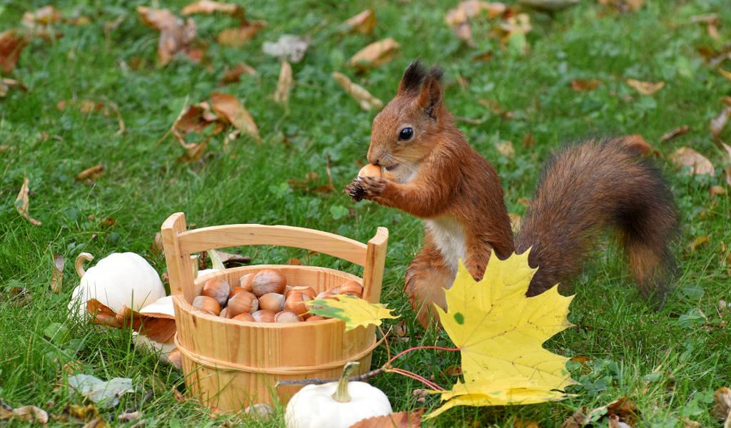 » Обои Рыжая белка грызет орехи на зеленой траве с желтыми листьями