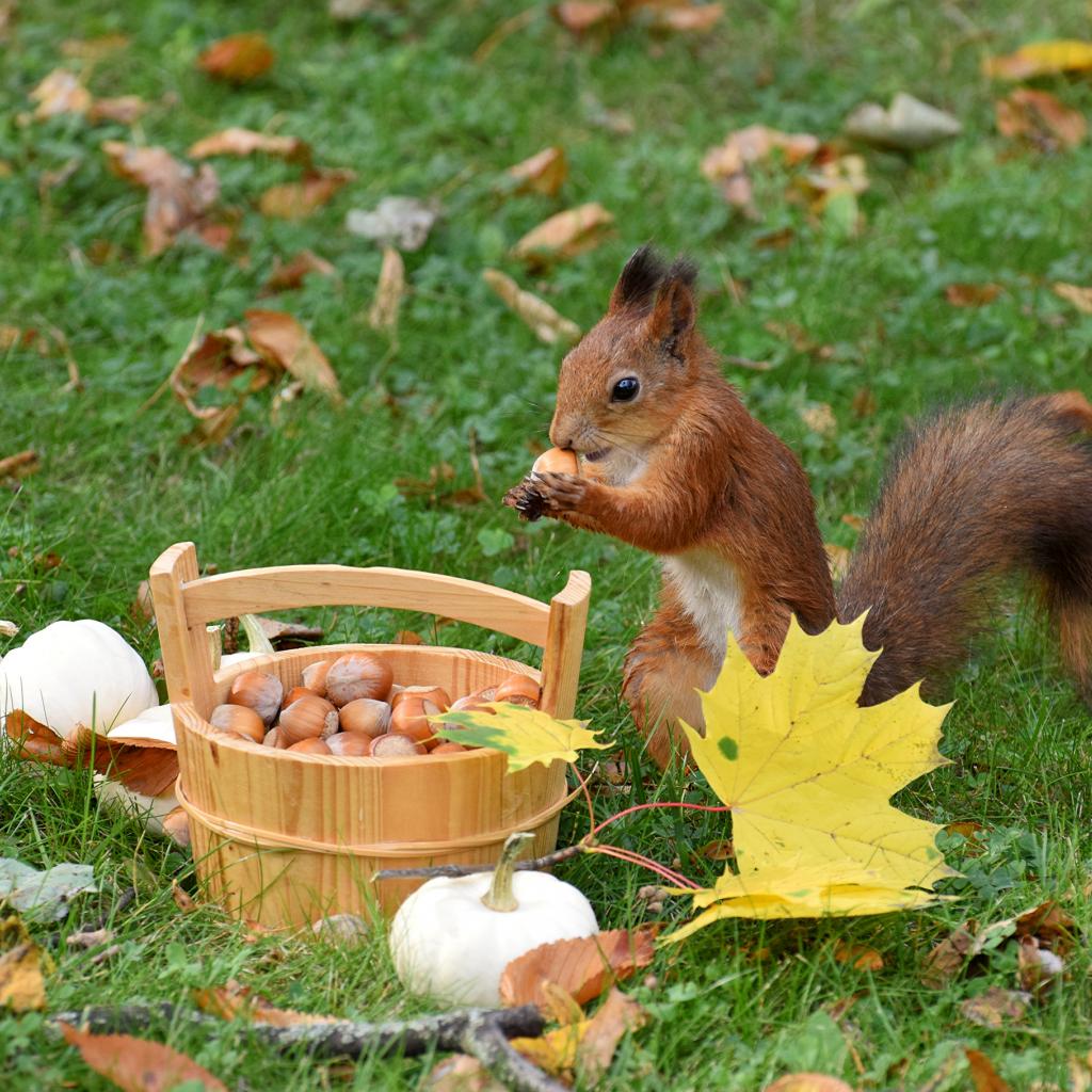 » Обои Рыжая белка грызет орехи на зеленой траве с желтыми листьями