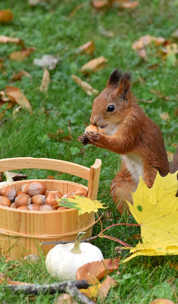 » Обои Рыжая белка грызет орехи на зеленой траве с желтыми листьями