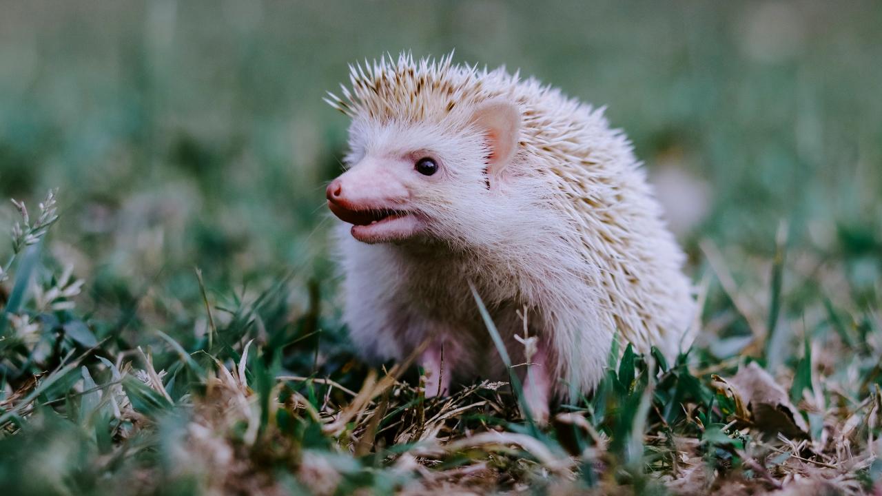 Обои Забавный белый еж на зеленой траве