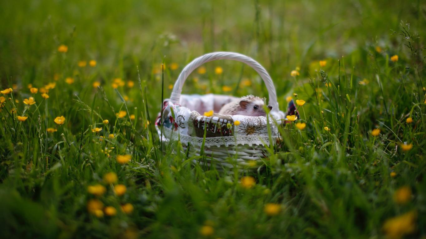 Обои Маленький еж в корзине на зеленой траве