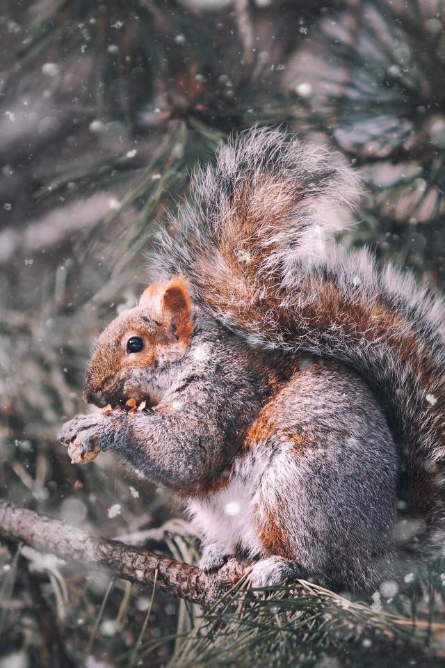 Обои Белка грызет орех на ветке сосны зимой