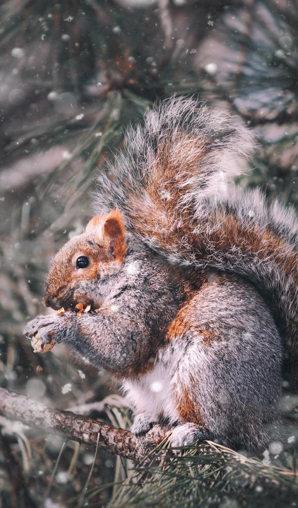 Обои Белка грызет орех на ветке сосны зимой