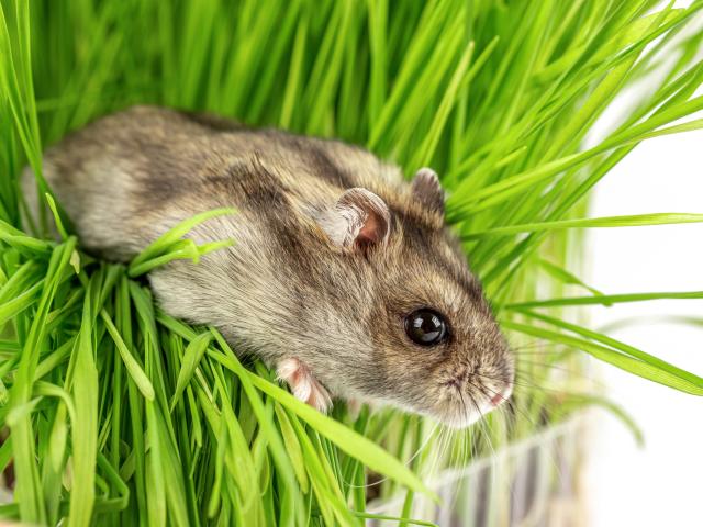 Обои Маленький серый хомяк в зеленой траве на белом фоне