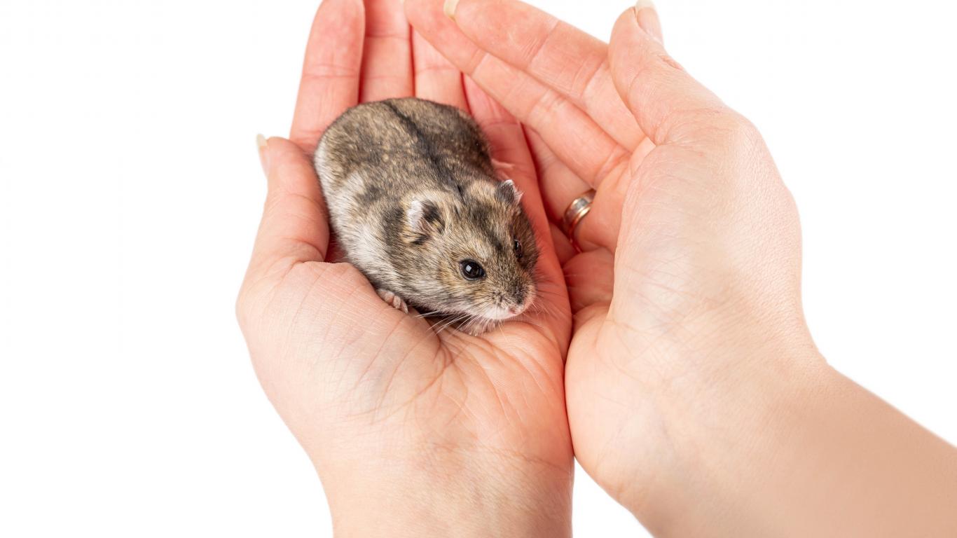 Обои Маленький серый хомяк сидит на ладонях
