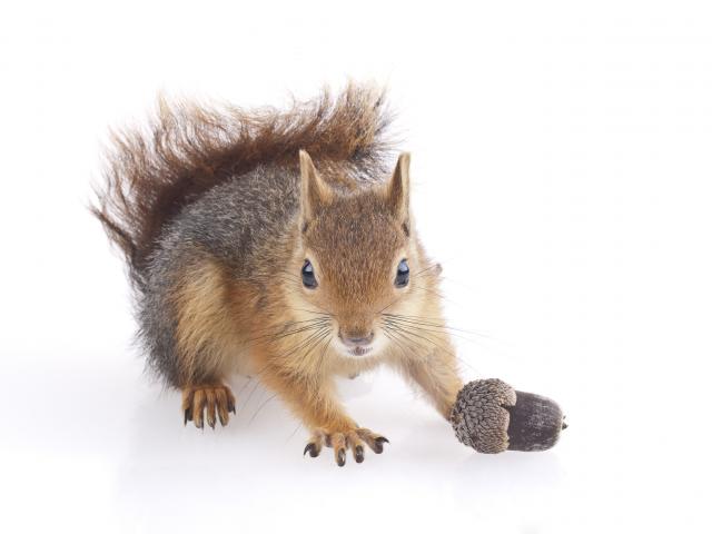 Обои Забавная белка с желудем на белом фоне