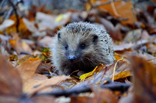 Обои Колючий еж идет по желтой опавшей листве