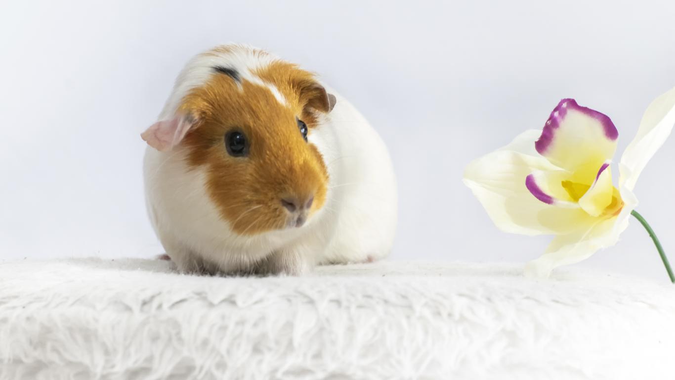 Обои Морская свинка с белым цветком орхидеи