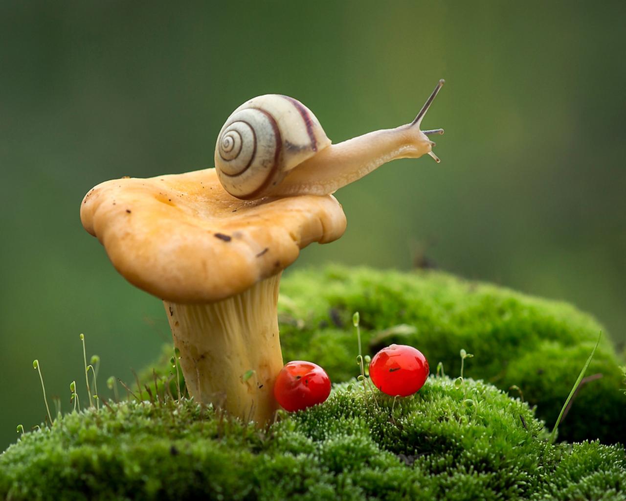 Обои Улитка сидит на лесном грибе фото крупным планом