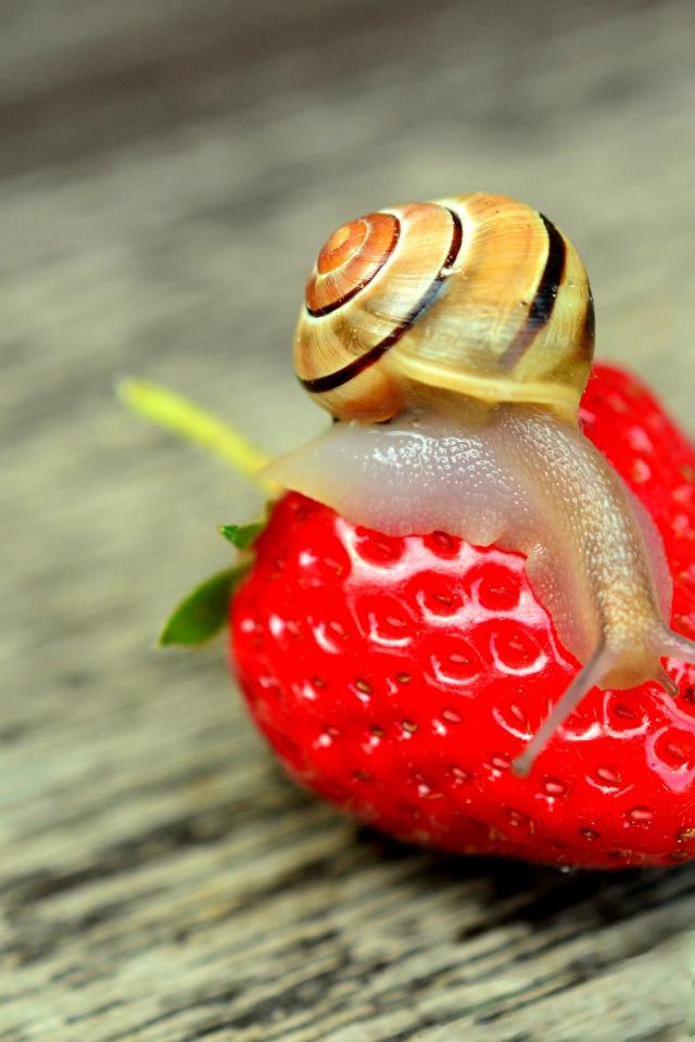 Обои Улитка сидит на красной спелой клубнике