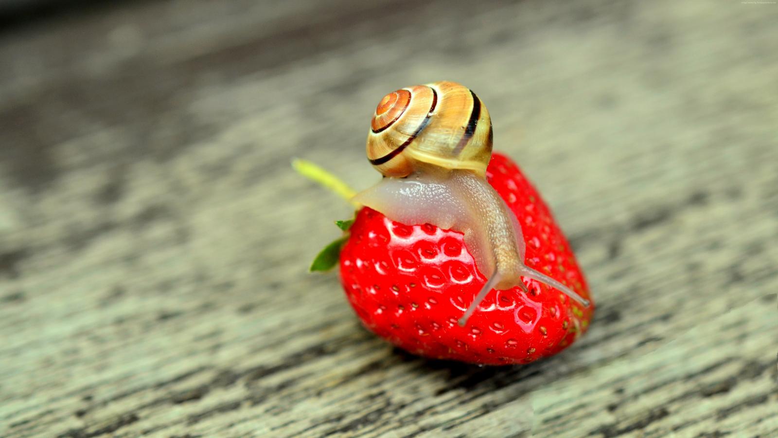 Обои Улитка сидит на красной спелой клубнике
