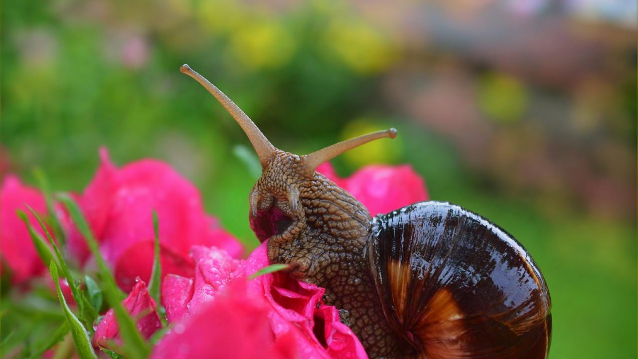 Обои Большая улитка на розовом цветке розы