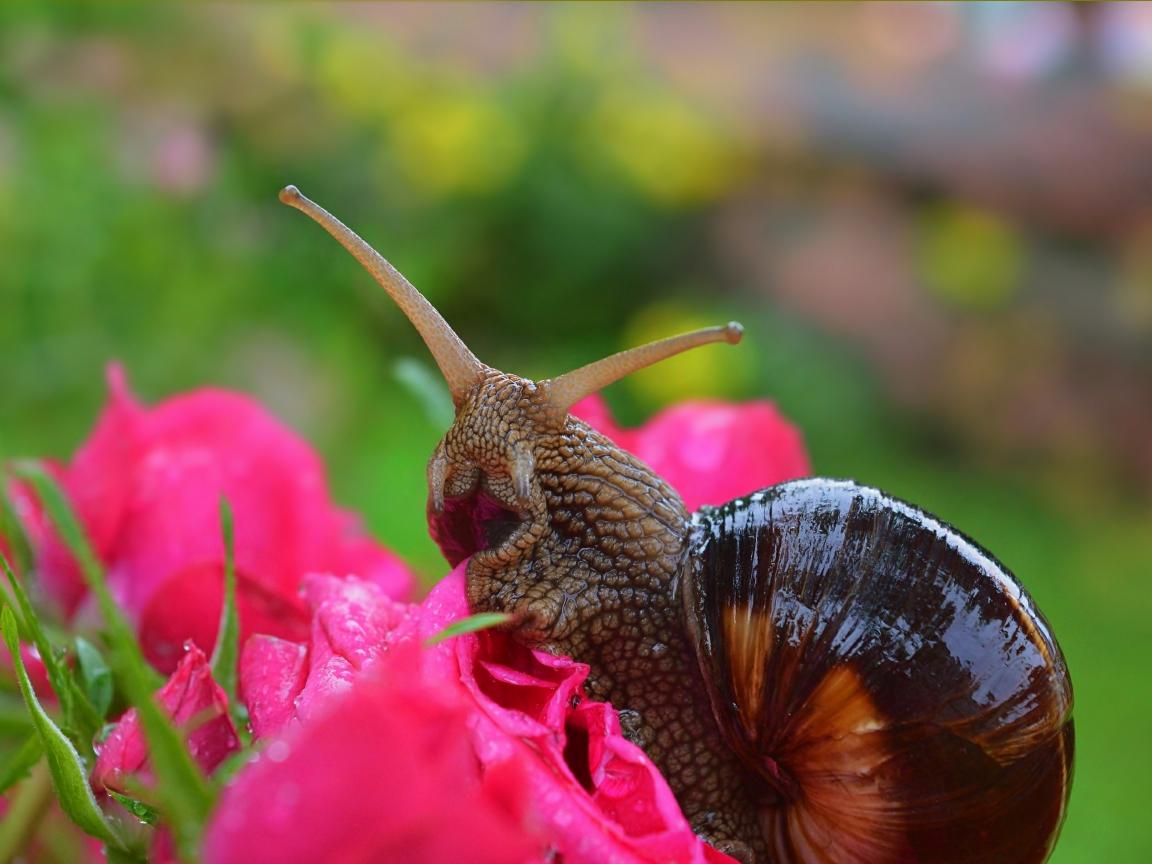 Обои Большая улитка на розовом цветке розы
