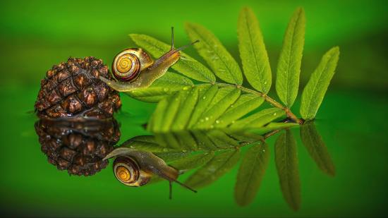 Обои Улитка на зеленом листе в воде