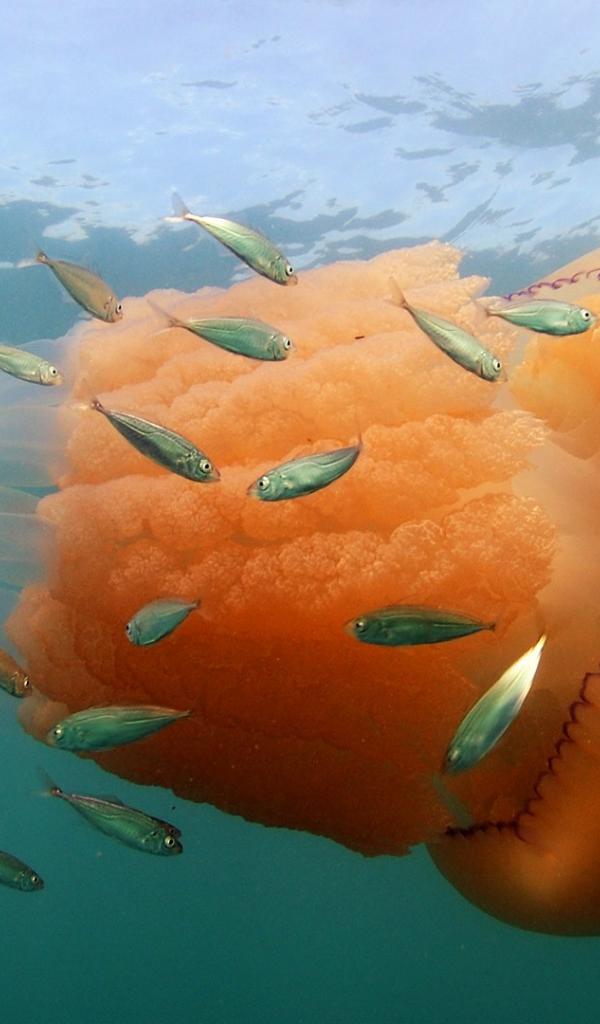 Обои Оранжевая медуза с маленькими рыбками