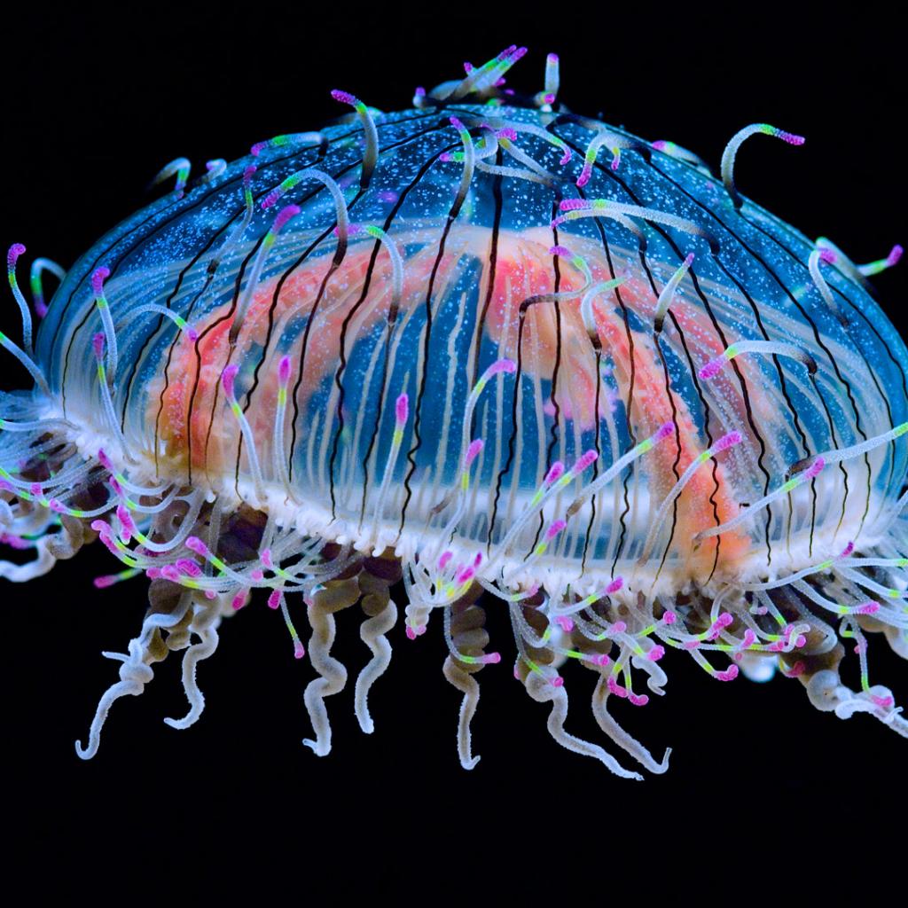 Обои Красивая разноцветная медуза на черном фоне